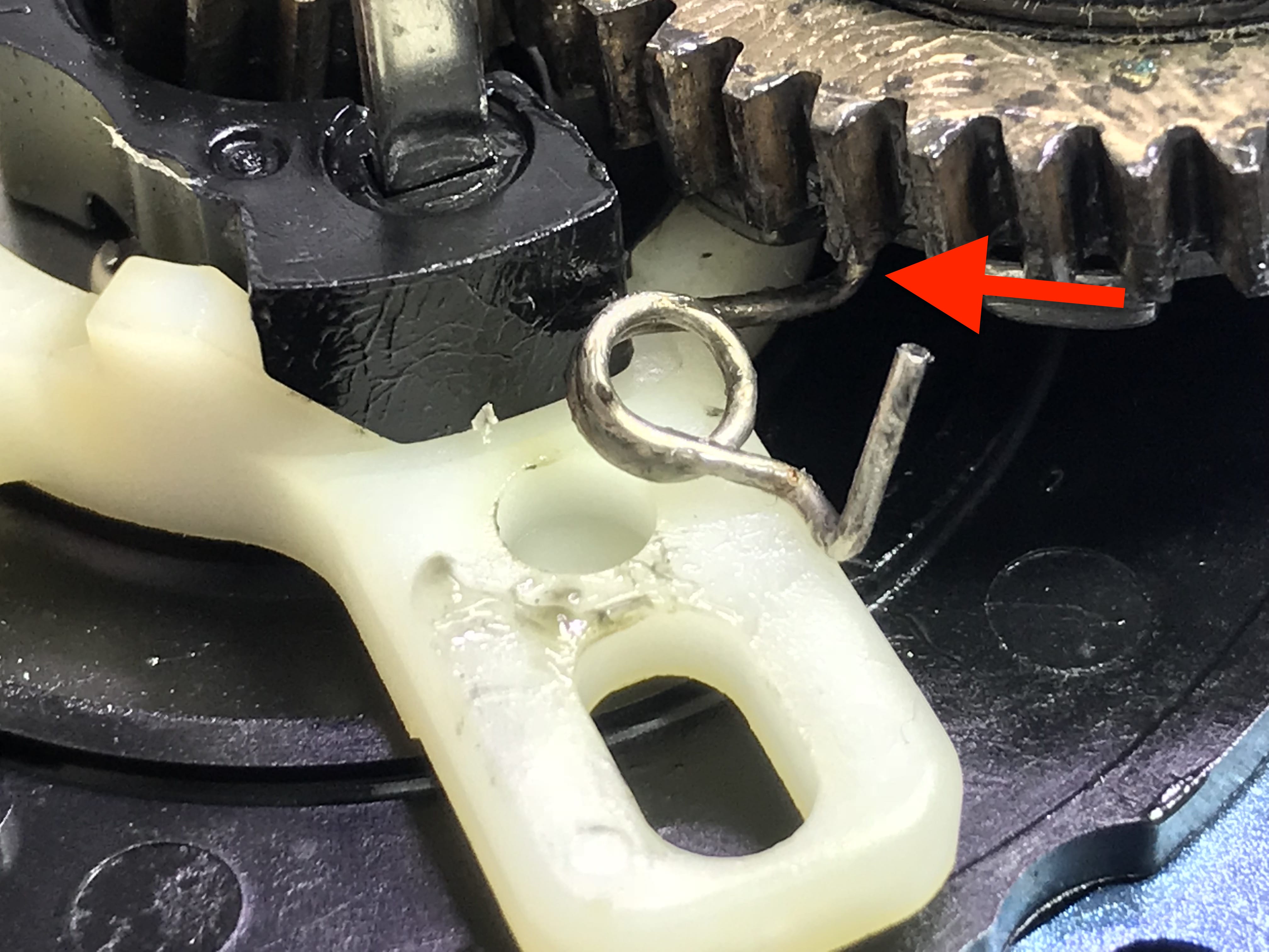 잡아주는 와이어 부속이 드라이브기어에 끼였네요.