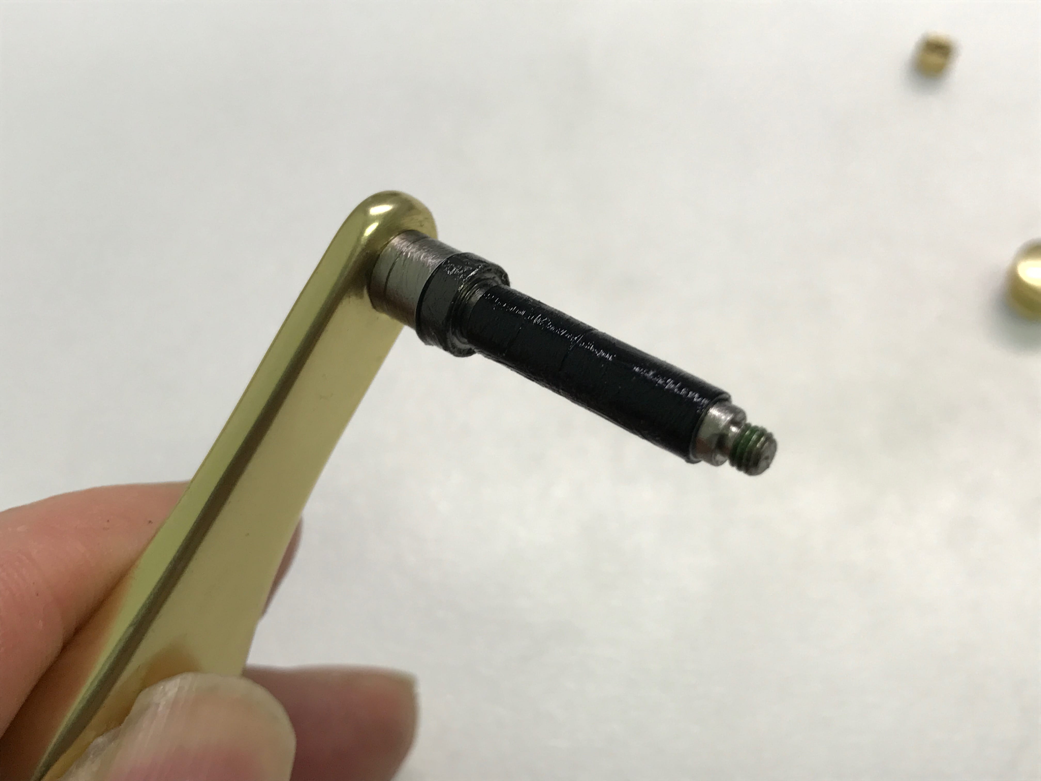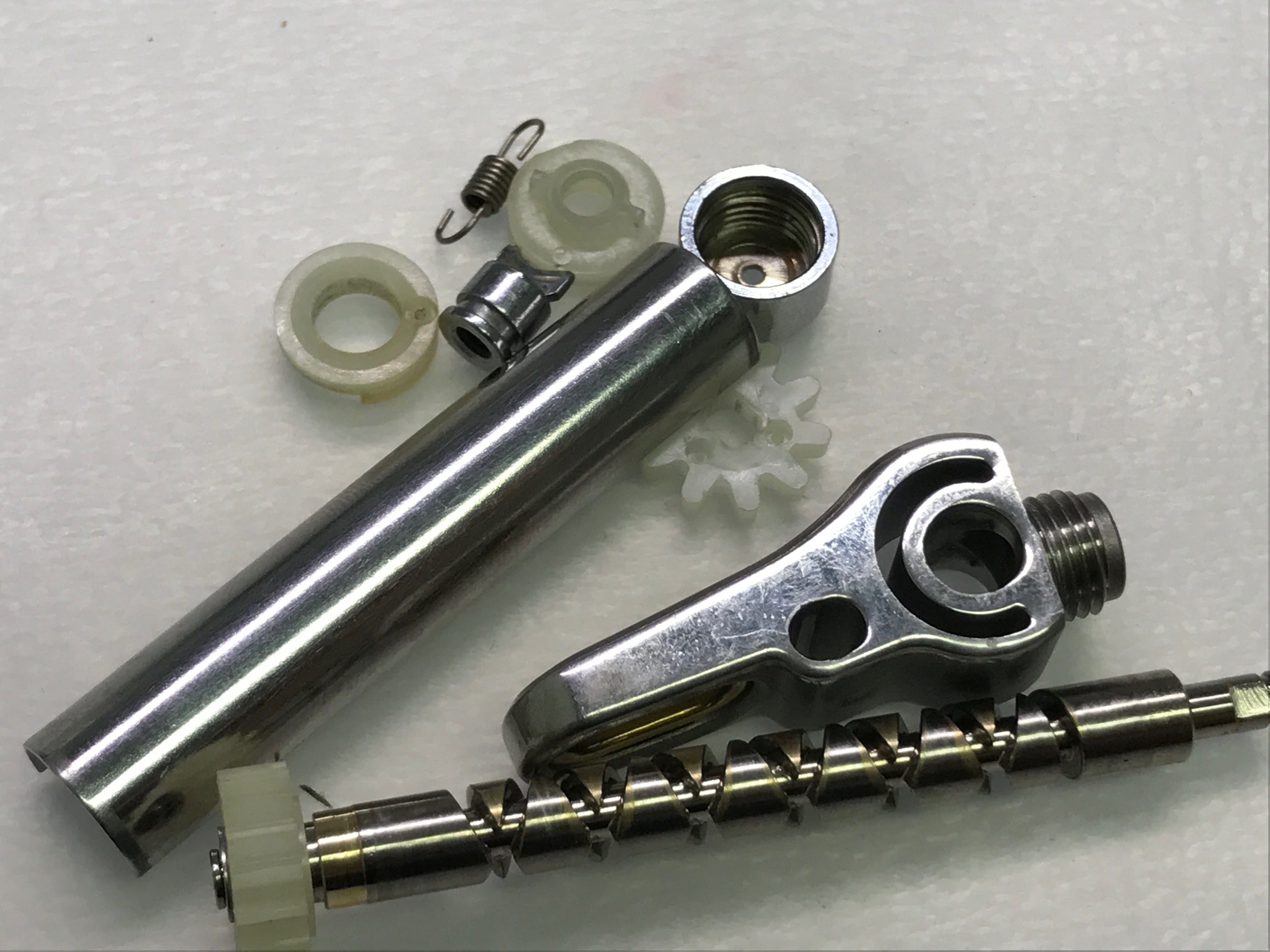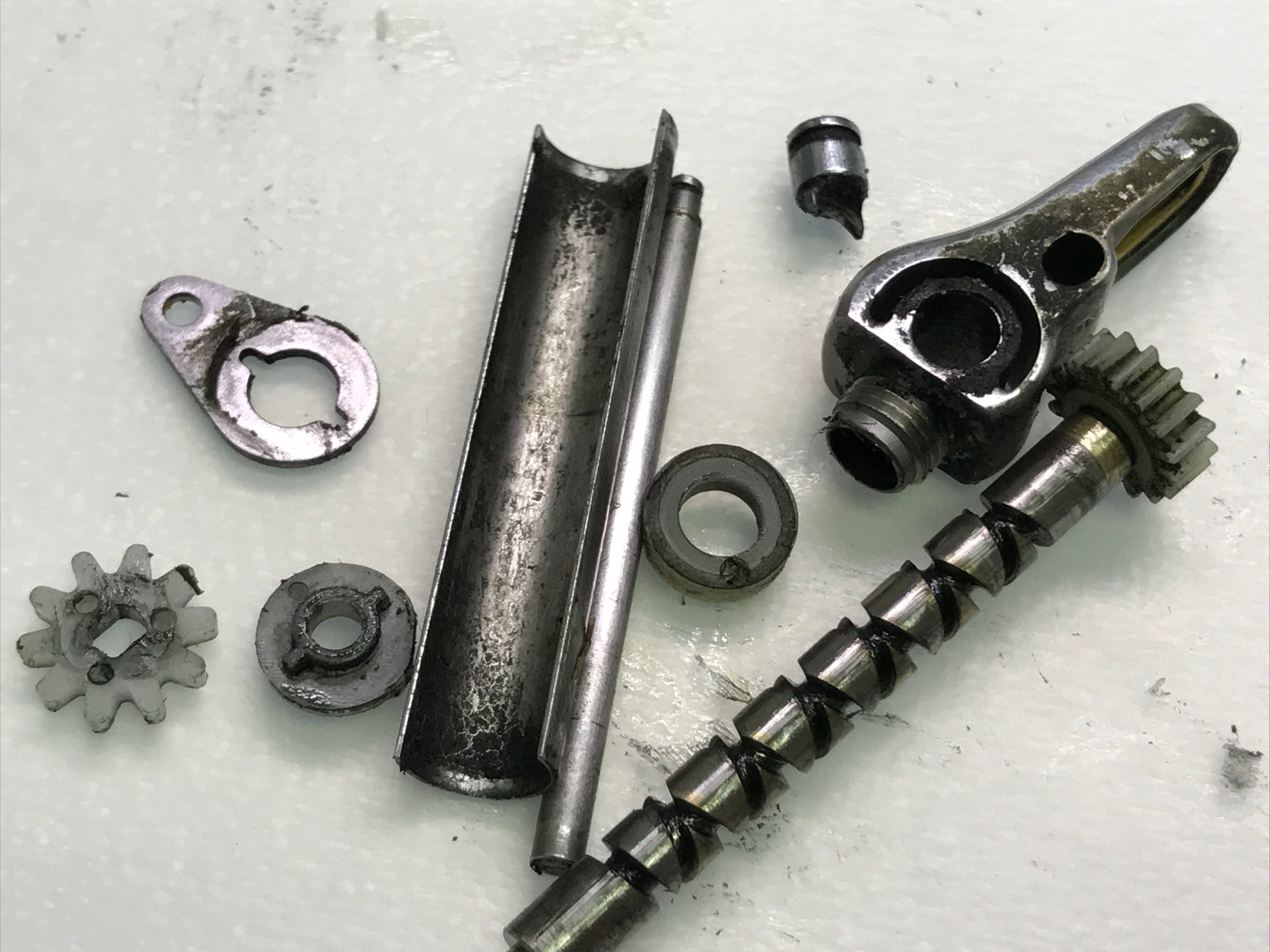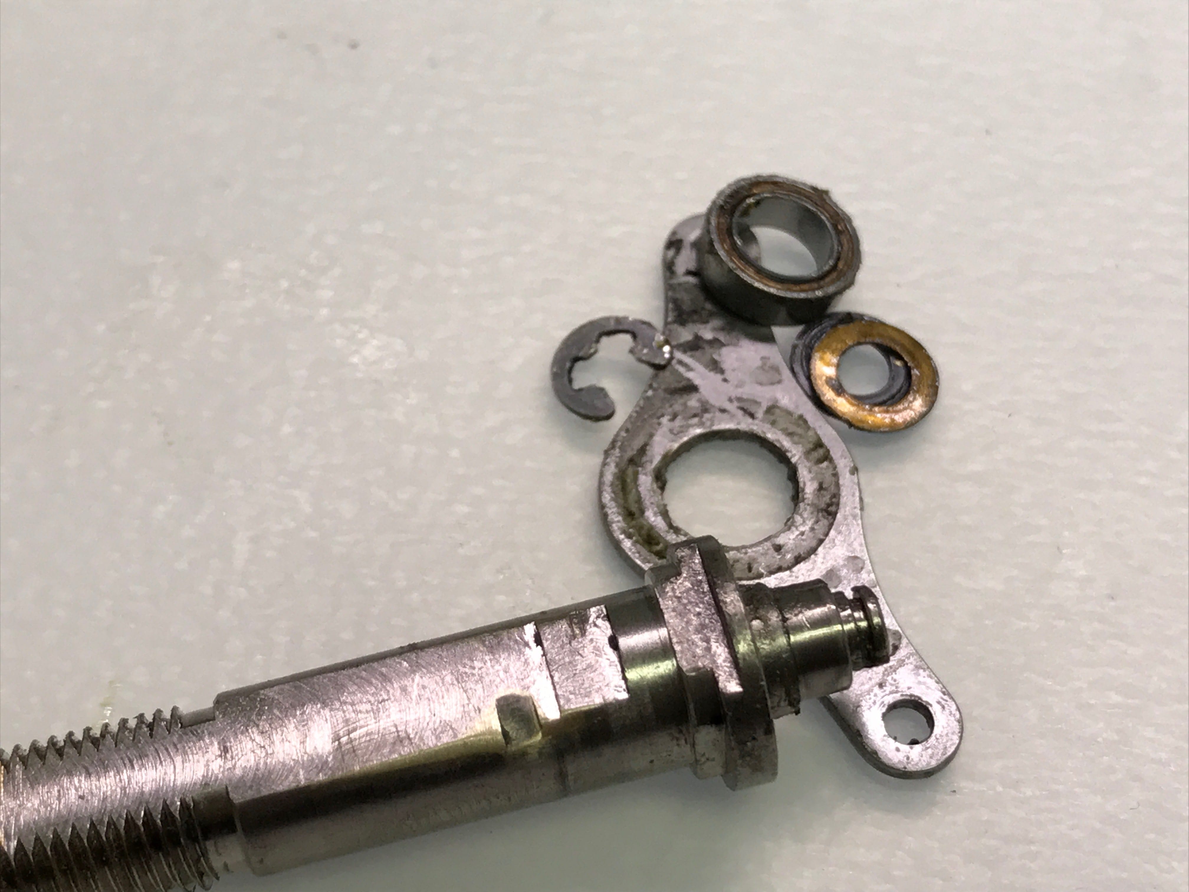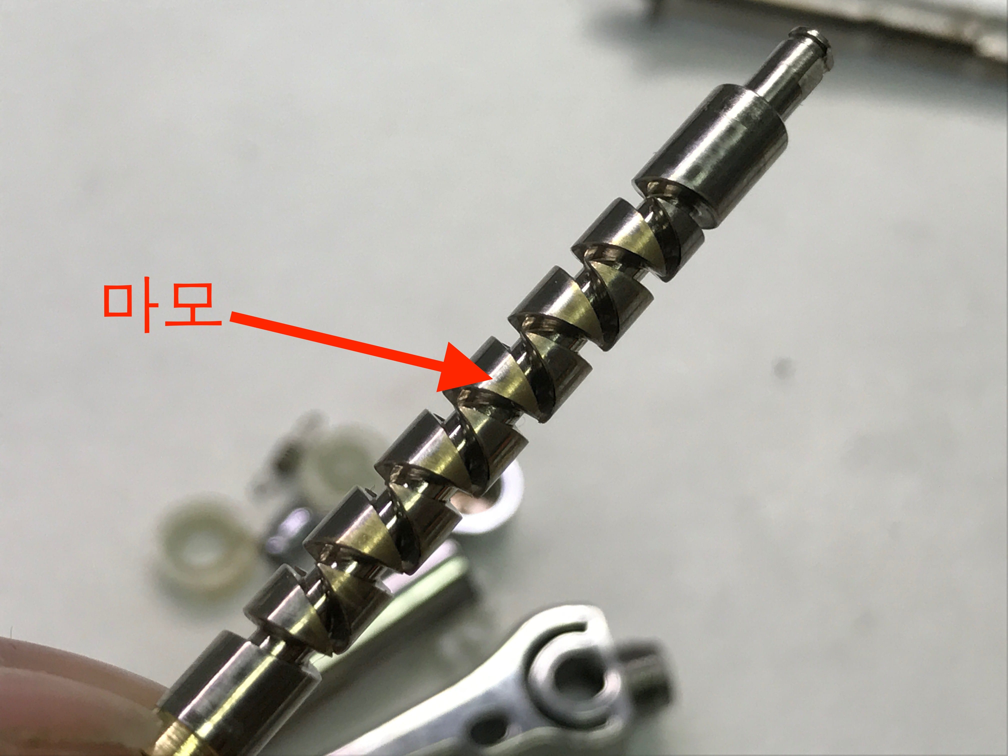 아래의 사진을 보시면 웜기어에 원래의 색상은 은색 마모된 곳은 금색으로 보입니다.
